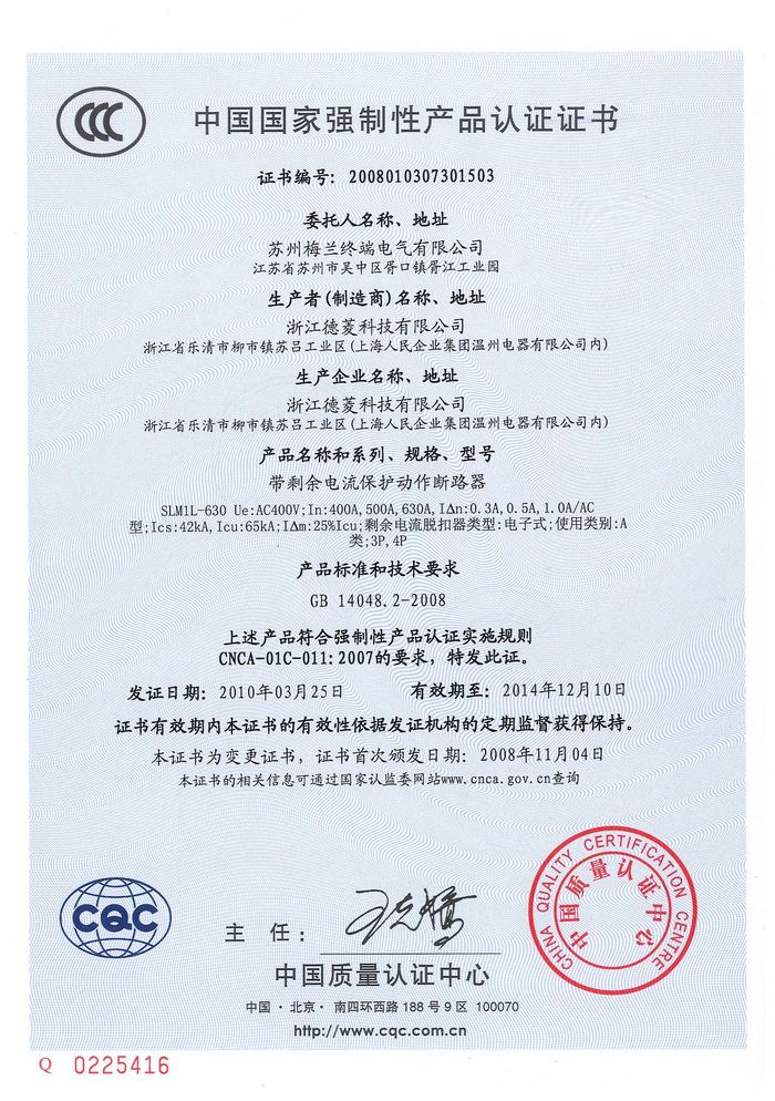 SLM1L-630塑殼漏電資質(zhì)證書(shū)