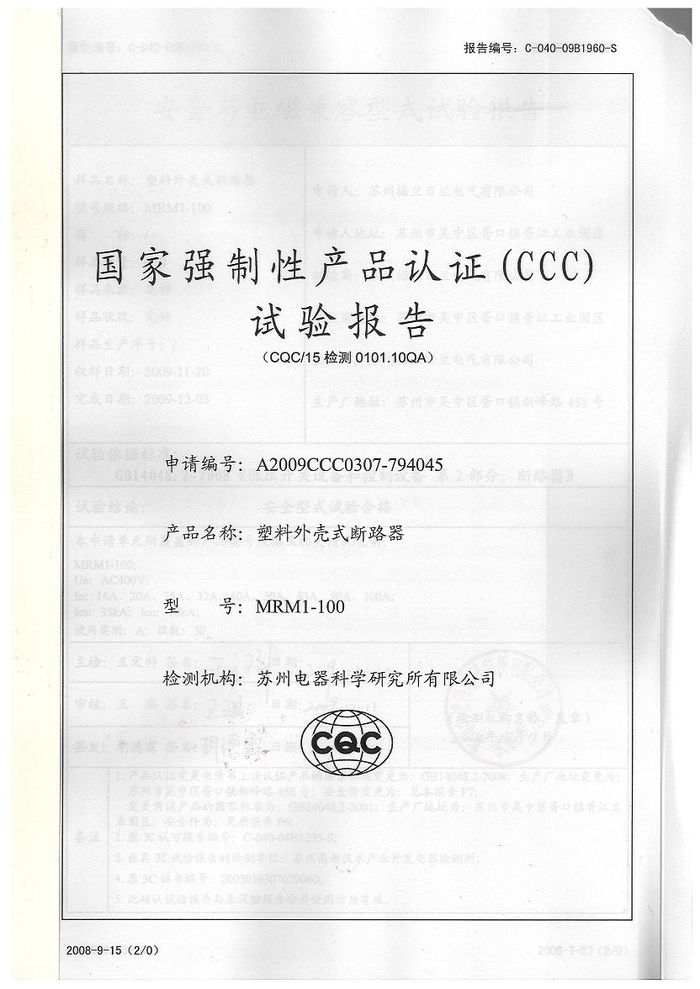 MRM1-100塑殼斷路器資質(zhì)證書(shū)