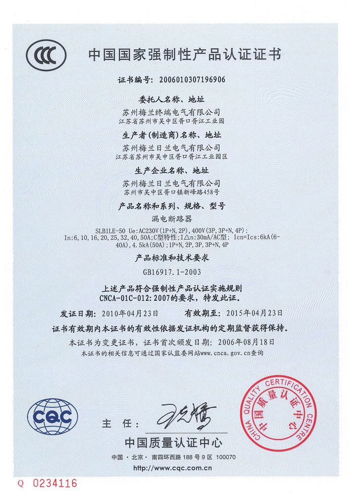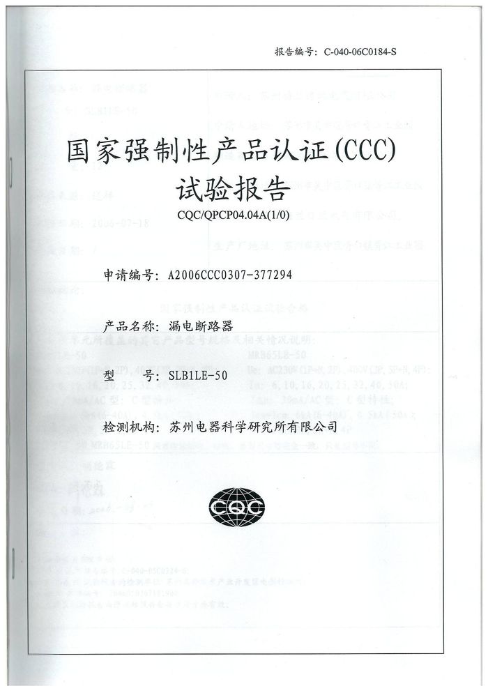 SLBLE-50漏電斷路器資質(zhì)證書