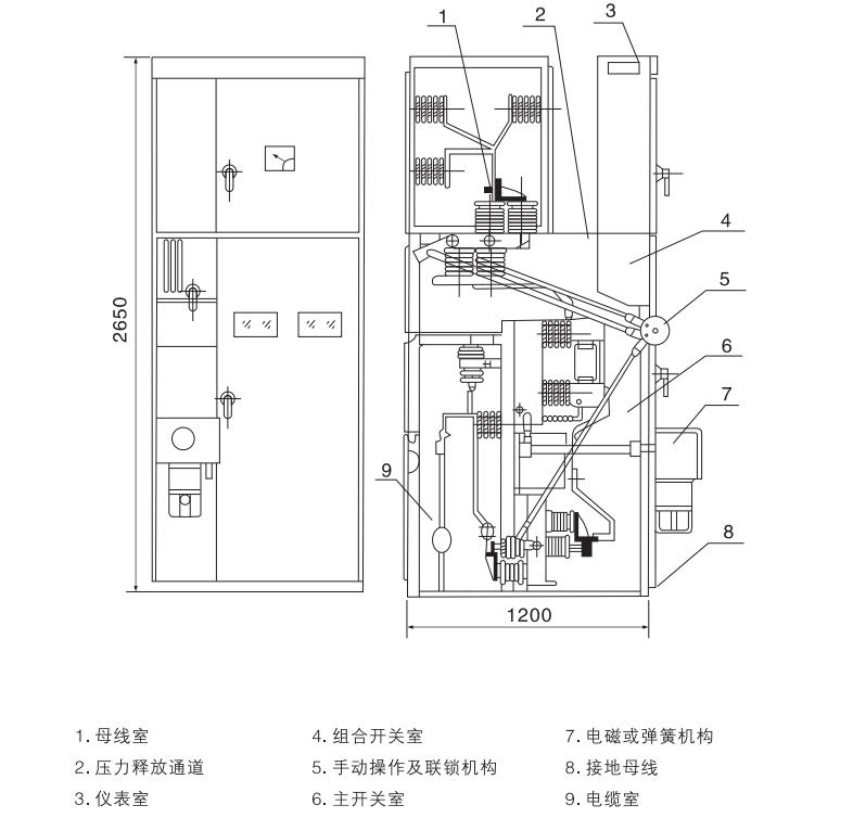 本開(kāi)關(guān)柜為金屬封閉箱型結(jié)構(gòu),柜體骨架由角鋼焊接而成.柜內(nèi)用鋼板分隔成斷路器室,母線室,電纜室,繼電器室,并可通過(guò)門面上的觀察窗和照明燈觀察柜內(nèi)各主要元件的運(yùn)行情況。為提高開(kāi)關(guān)柜的技術(shù)性能,各主要元件進(jìn)行了重新設(shè)計(jì)(如斷路器,旋轉(zhuǎn)式隔離開(kāi)關(guān)等),根據(jù)柜體布置,繼電器室可安裝繼電器,門上可裝設(shè)信號(hào)繼電器、指示儀表、信號(hào)燈,轉(zhuǎn)換開(kāi)關(guān)安裝于操作小室。后面為母線室,下面為電纜室,用戶可方便地進(jìn)行接線,前面為斷路器室,方便了開(kāi)關(guān)柜主開(kāi)關(guān)的檢修,柜體內(nèi)部機(jī)構(gòu)參見(jiàn)圖1、圖2和產(chǎn)品說(shuō)明書(shū)。